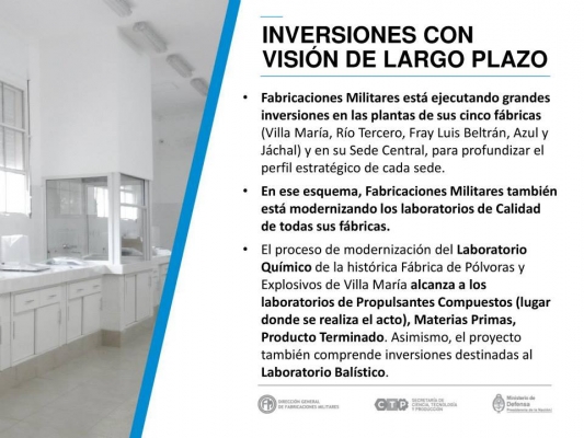 鈥淒urante el transcurso de nuestro trabajo se produjeron adem谩s transformaciones dentro de nuestra propia organizaci贸n, con el paso de Fabricaciones Militares a la 贸rbita del Ministerio de Defensa y la creaci贸n de la Secretar铆a de Ciencia, Tecnolog铆a y Producci贸n. A partir de esto FM pasa a conformar un grupo de empresas junto a la F谩brica Argentina de Aviones y el Complejo Industrial Naval Argentino. La idea es, a partir de la articulaci贸n de todas ellas, planificar y dirigir la reconfiguraci贸n de una cadena productiva鈥, indic贸 tambi茅n.