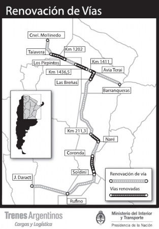 Según el nuevo mapa de obras presentado por la empresa Trenes Argentinos Cargas y Logística dependiente del Ministerio de Interior y Transporte de la Nación- son seis los tramos que fueron renovados y otros ocho que están en proceso de renovación con distinto grado de avance de las obras o de los procesos licitatorios.